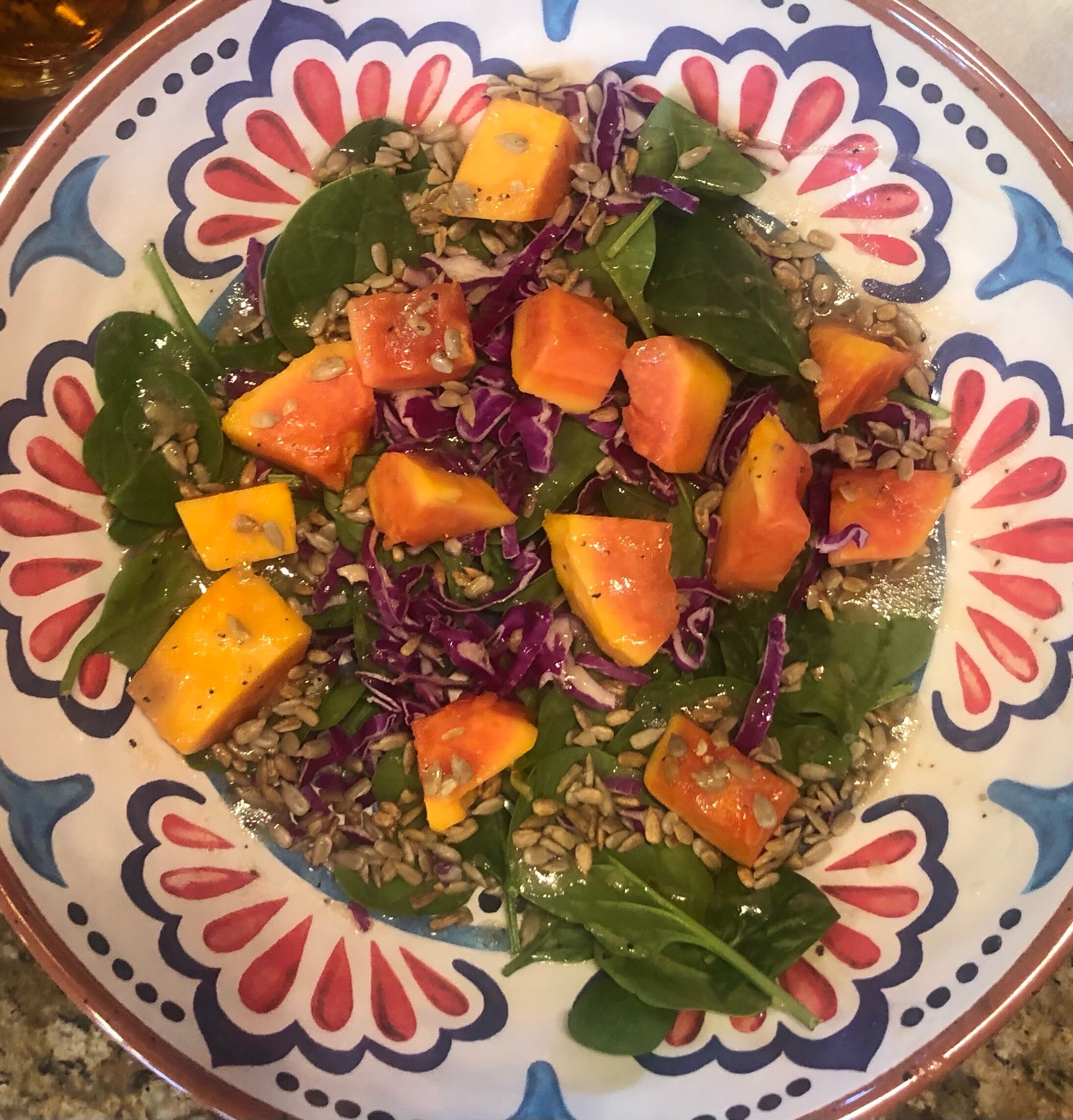 Turns out they do have whole papayas at Reasor’s in Tahlequah and that was this week’s “unusual” thing. Papaya chunks, added into a baby spinach salad, with shredded red cabbage and sunflower seeds. It was a great sweet (but not too sweet) contrast to the medium heat of the stew.