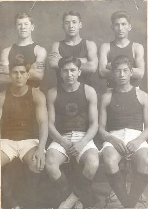 Here’s a similar photo from a few years later at the United States Indian Industrial School in Carlisle, Pennsylvania. Carlisle was considered the flagship Indian boarding school. Carlisle operated from 1879 until 1918. Check out Jim Thorpe in the upper left in the photo below.