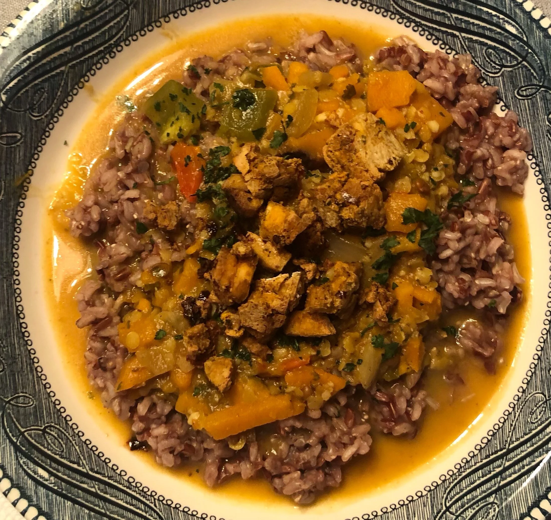 Here’s the crockpot dish: start with 3 sweet potatoes diced, one large yellow onion also diced, 3 tablespoons of chopped garlic, and a cup of red lentils stewing in two cups of vegetable broth and one cup of water. This Phase One stays in the crockpot alone for 2 hours. At the 2 hour mark, Phase 2 begins: throw in a can of coconut milk and another cup of water, a red and a green bell pepper chopped, a tablespoon of red curry paste and a tablespoon of green curry paste and an optional finely chopped 1/4 cup of cilantro. As this cooks for the next 2 hours, to taste, as more curry and some red pepper. At the 4 hour mark, this is served on a bed of rice - we used a mix of purple, black and brown rice. Topped with some of the CRUNCHY tofu for texture, but any protein source will do (or just plain).