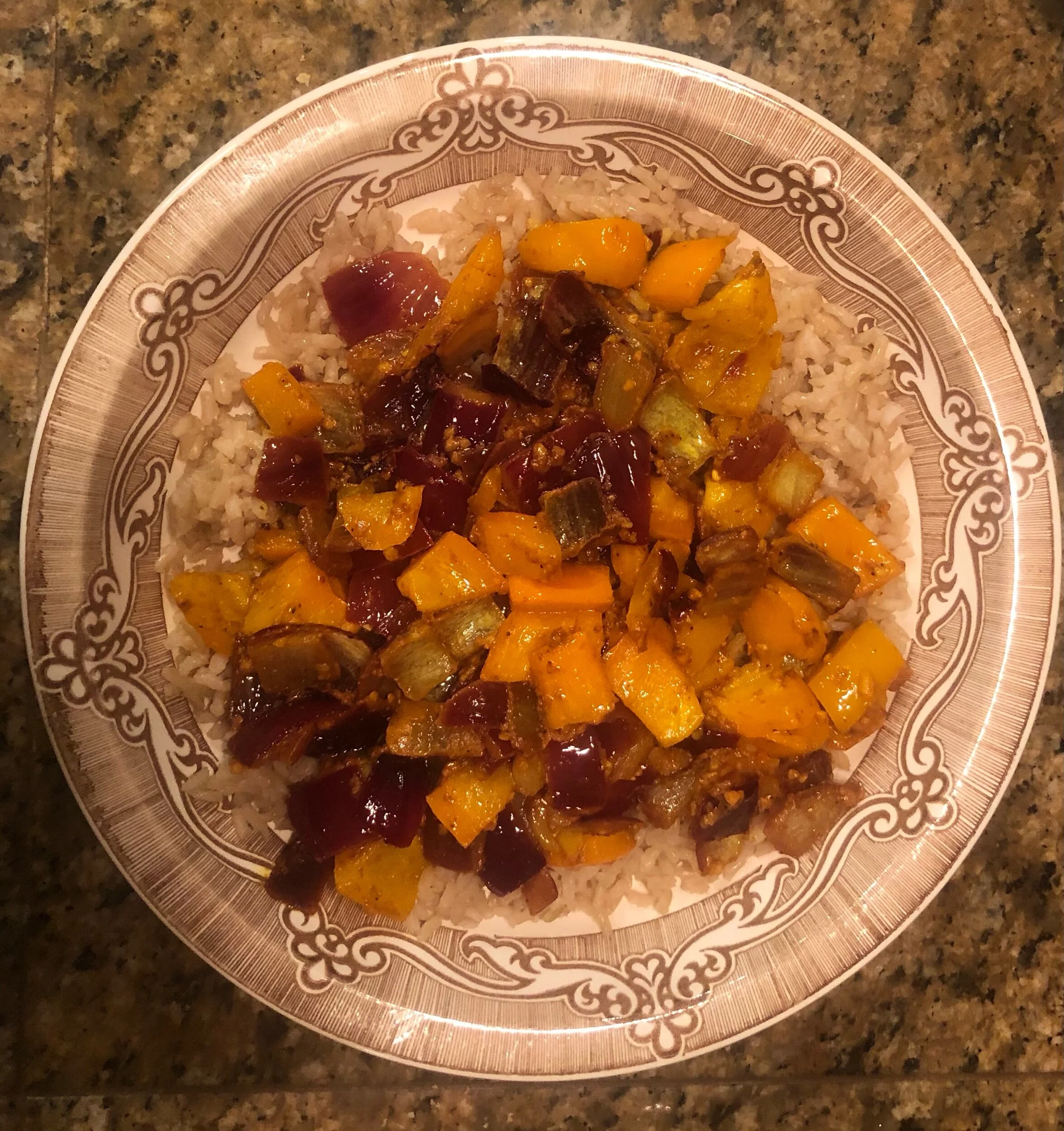 In a large skillet, put just enough olive oil to cover a thin coat on the bottom of the pan and start on medium temp. First add one large chopped onion, any color. Then add 2 table spoons of chopped garlic. Let those 2 ingredients cook in the oil for about 5 minutes. Then add one large bell pepper, any color and one large spoonful of Golden Paste. Cook for 5 more minutes. Done. Serve with a moderate amount of brown rice.