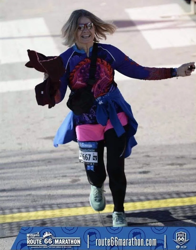 As my confidence increased it seemed only fair to train for more, like a marathon. Cindy Impson agreed to train with me for a four month program. We faithfully completed it. Cindy and I did the Route 66 Marathon in about 6 hours, (I was 74). After checking this off my bucket list, Sheryl Ridenhour, Cindy and I continue to do half marathons, 5ks and 10ks.